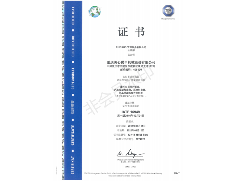 会社はIATF16949国際品質システムの認証を取得して、そしてシステムの要求に従って絶えず完備して、基礎管理を突き固めて、精益生産を推進して、人力資源管理システムを完備して、お客様のためにサービスする総合能力を高めるように努力している。会社は全面的に社会責任を履行し、環境保護、安全、職業健康面への投入を増大し、国家関係の達成認証を取得した以外に、ISO140環境管理システム認証とISO4501 職業健康安全管理システムの認証を取得した。